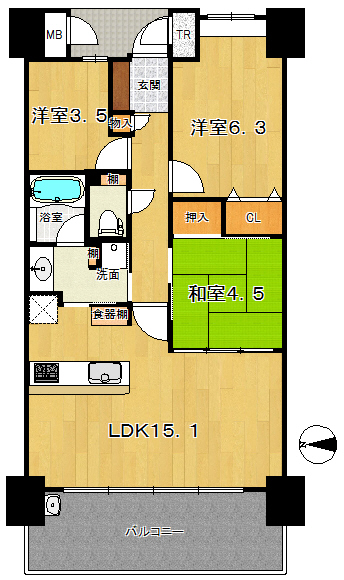 | 間取内容 | リビングダイニングキッチン11.8帖、和室4.5帖、洋室6.3帖、洋室3.5帖 |
